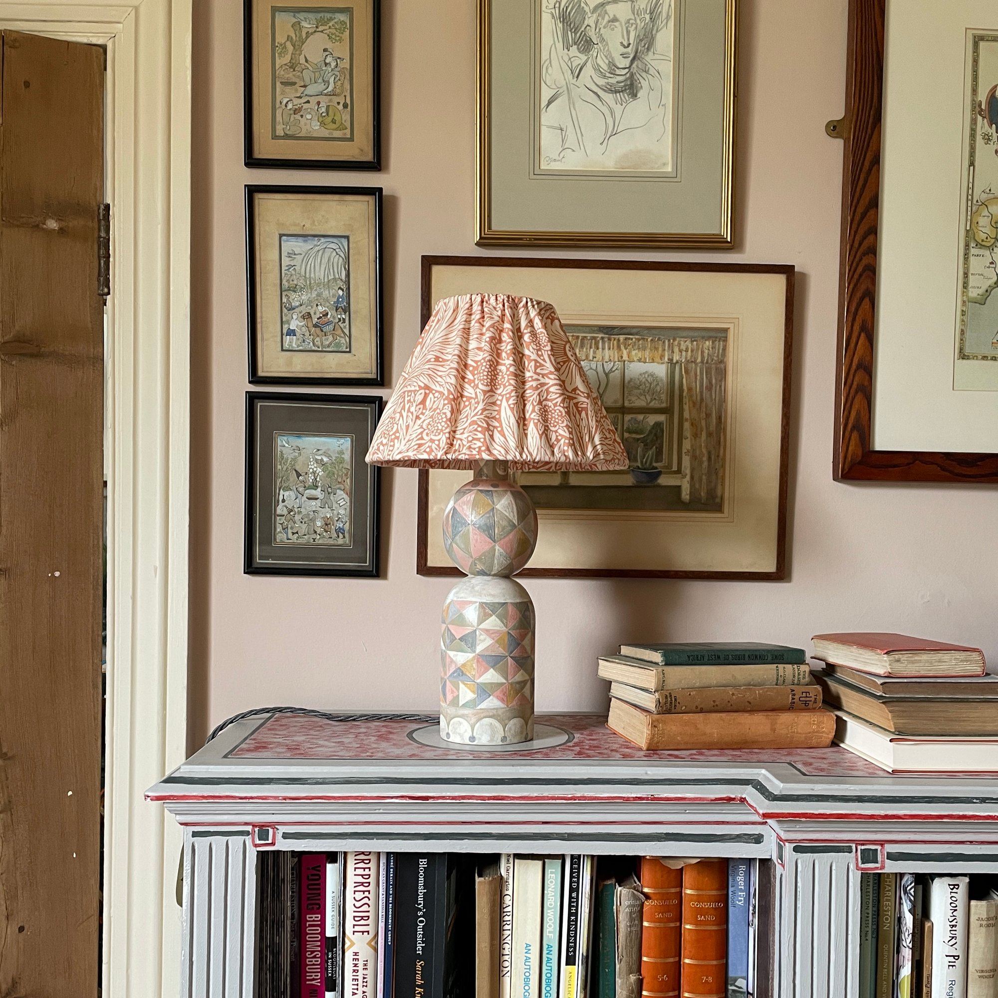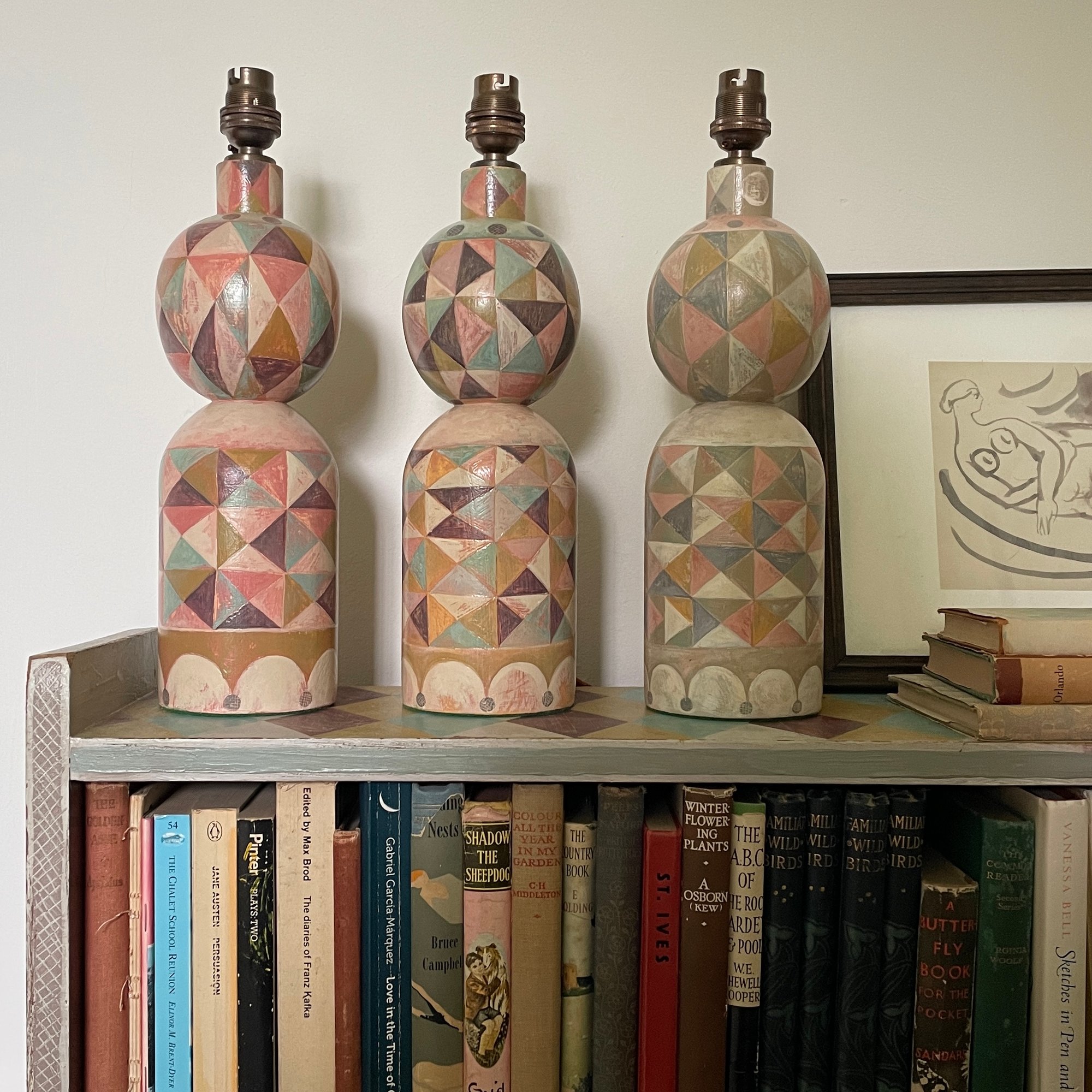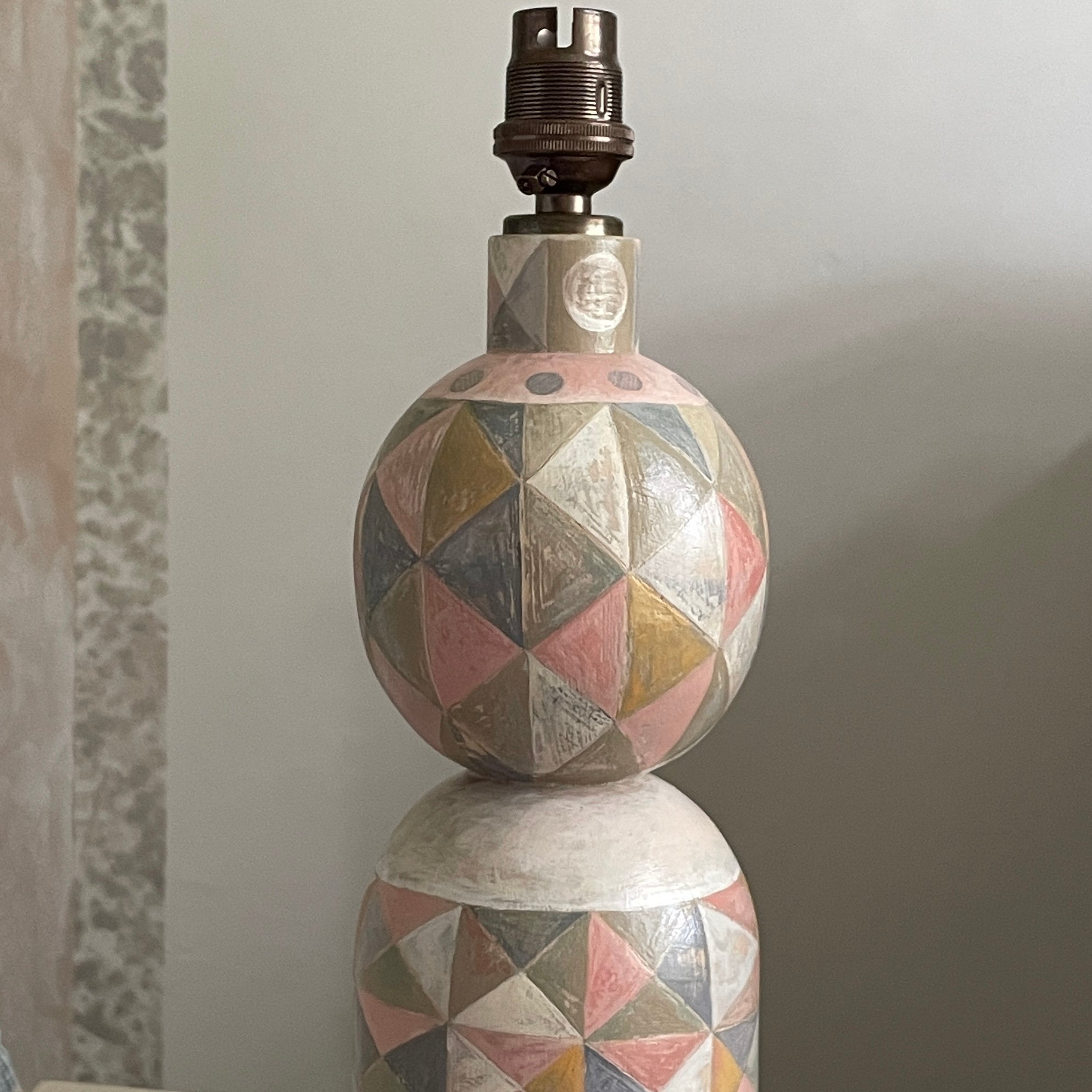 Tall solid beech table lamp hand painted with chalk paint in geometric pattern.