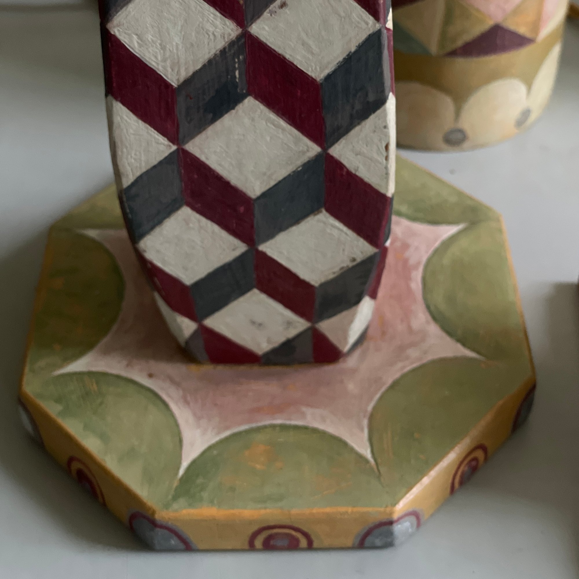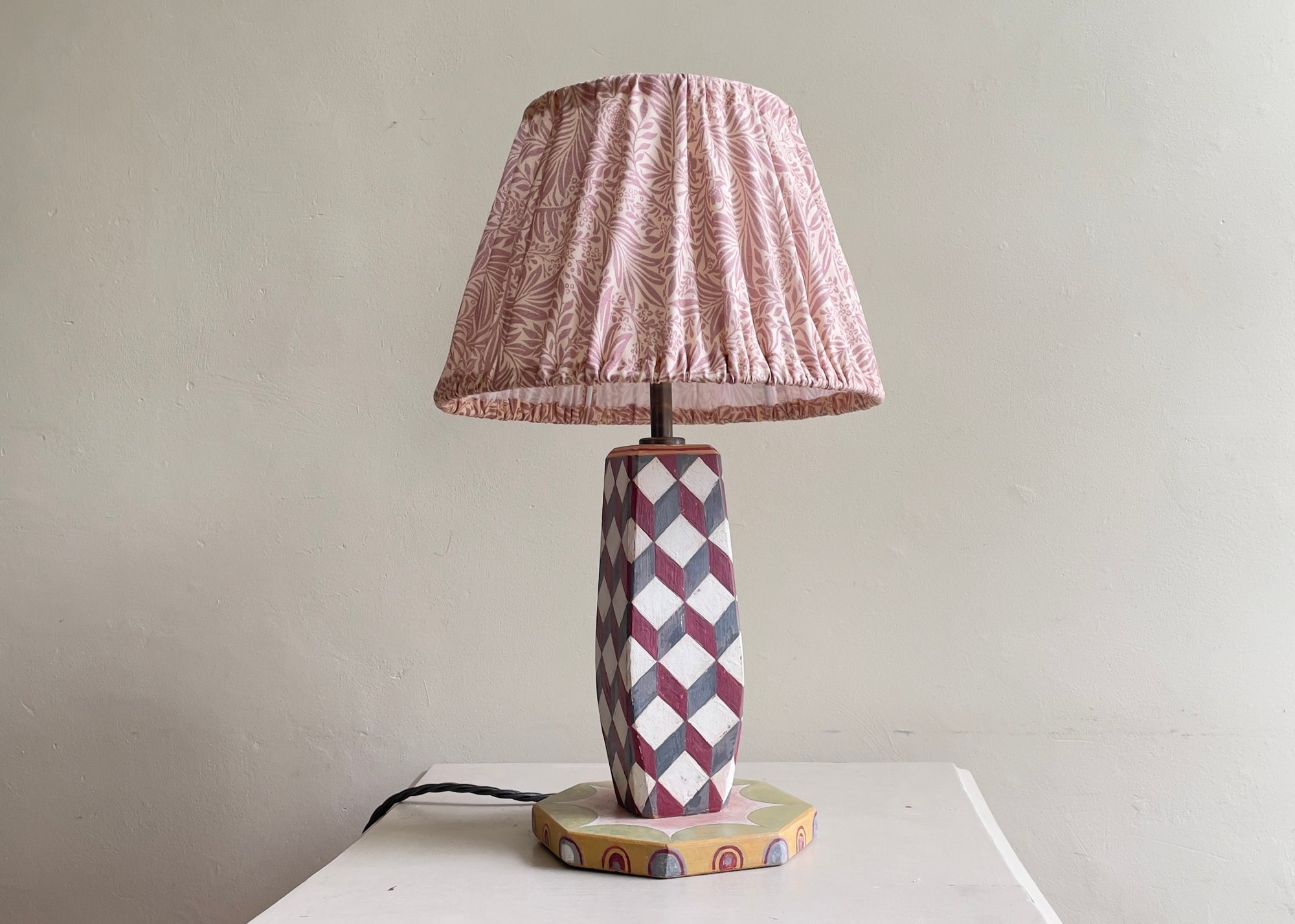 Vintage wooden table lamp hand painted with chalk paint in geometric pattern.
