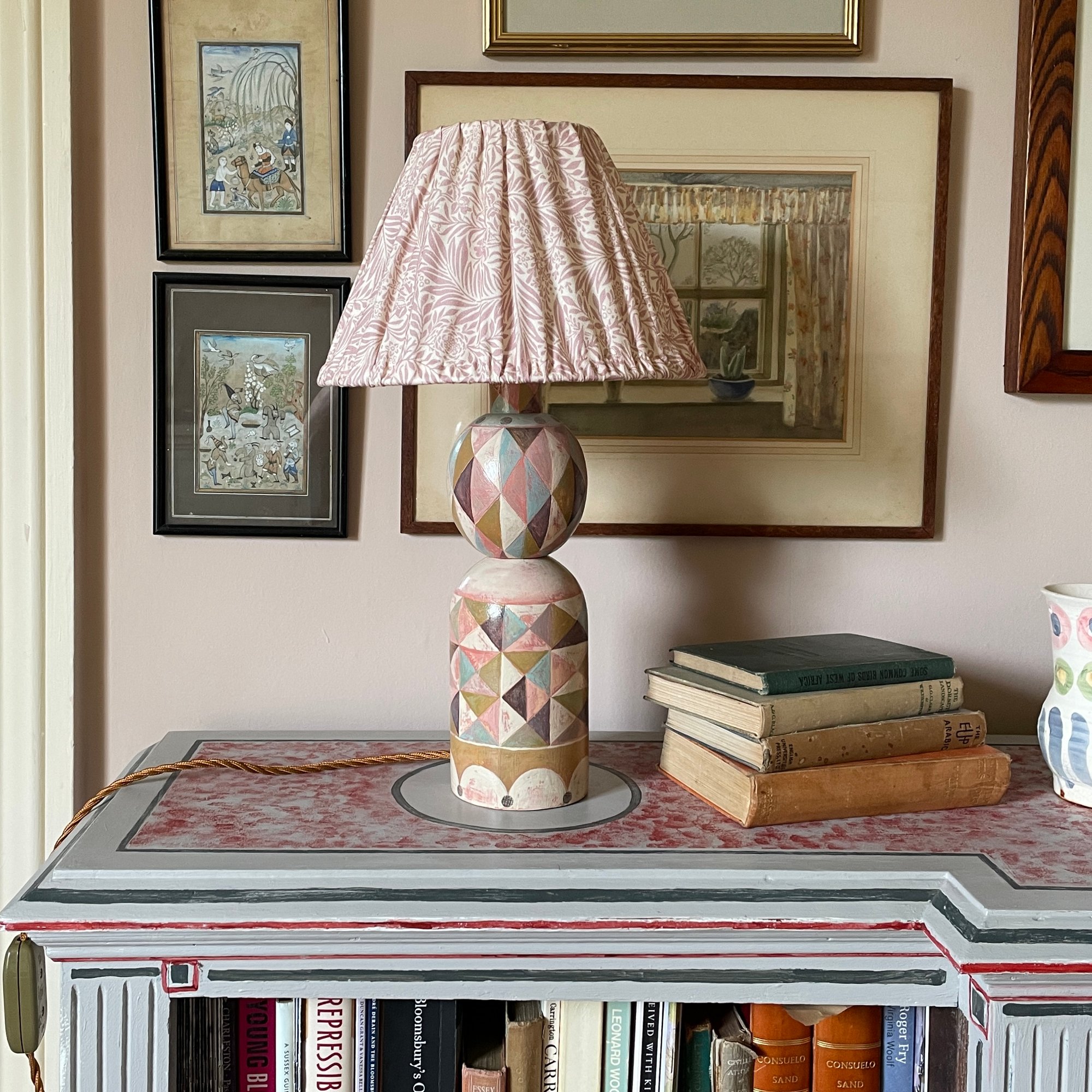 Tall solid beech table lamp hand painted with chalk paint in geometric pattern.